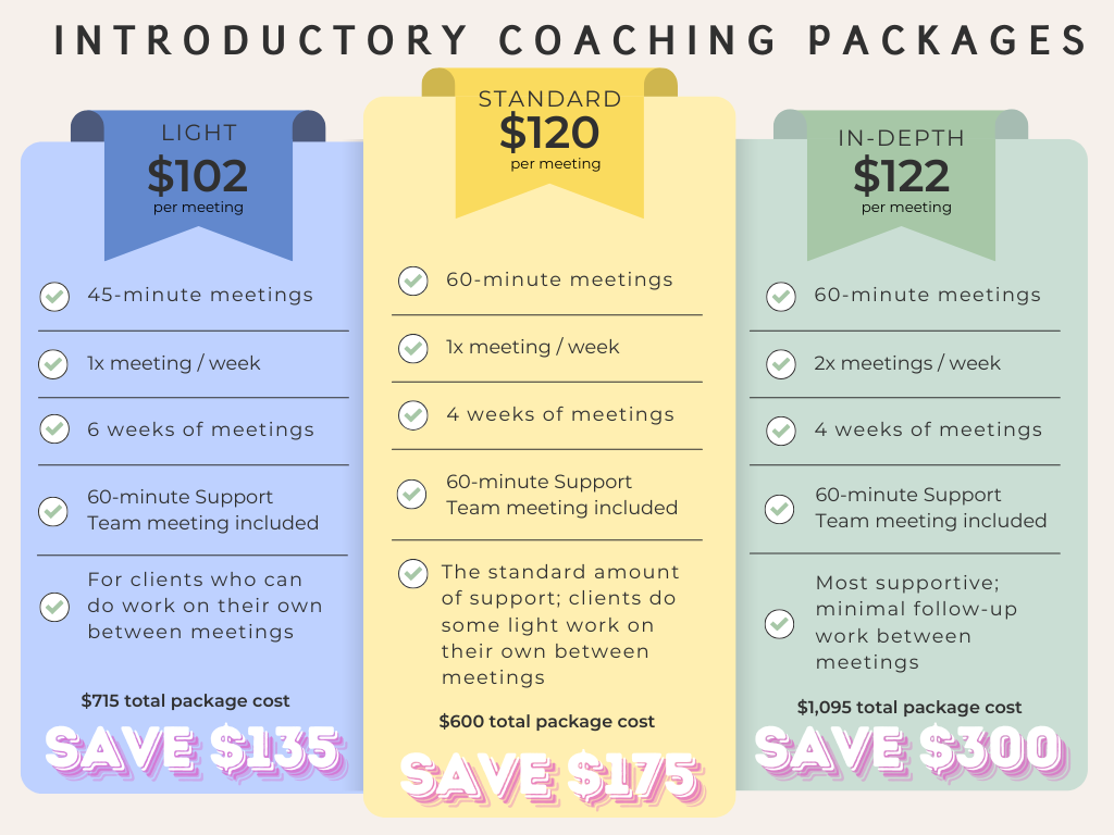 Note: If the below costs are outside of your budget, please fill out the Reduced Fee Application — we’re committed to keeping our services accessible to as many neurodivergent people as possible!